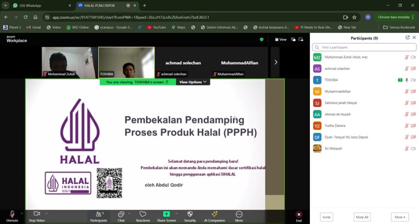 Kegiatan pembekalan yang digelar secara daring pada Senin (23/6/2025) pukul 16.00–18.00 WIB ini dibuka langsung oleh Ketua Tanfidziyah PCNU Kota Depok, KH Achmad Solechan. Dalam sambutannya, ia menekankan pentingnya peran para pendamping halal dalam membimbing pelaku usaha.