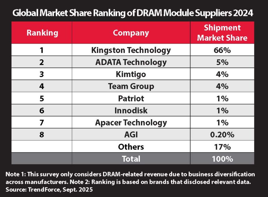 Kingston Technology kembali menegaskan dominasinya di industri teknologi global dengan meraih posisi teratas sebagai pemasok modul DRAM pihak ketiga terbesar di dunia. Berdasarkan laporan terbaru firma analis TrendForce, Kingston menguasai sekitar 66% pangsa pasar global pada tahun 2024.