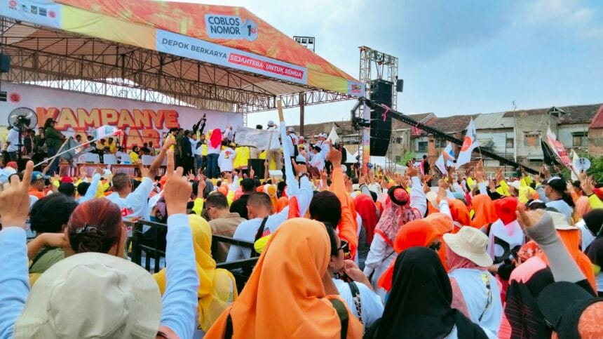 Meledak, pendukung Imam-Ririn padati Stadion Mahakam Jl. Mahakam No.36, Bakti Jaya, Kec. Sukmajaya, Kota Depok, Jawa Barat yang dilaksanakan, pada Sabtu (23/11/2024) diacara Kampanye Akbar putaran terakhir.