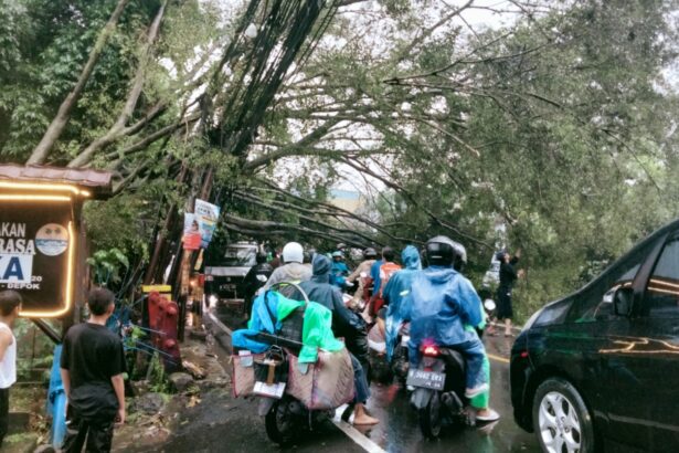 Dataradio.id | Sawangan Baru Hujan deras disertai angin kencang menyebabkan sebuah pohon besar tumbang di Jalan Raya Muchtar, Sawangan Baru,…