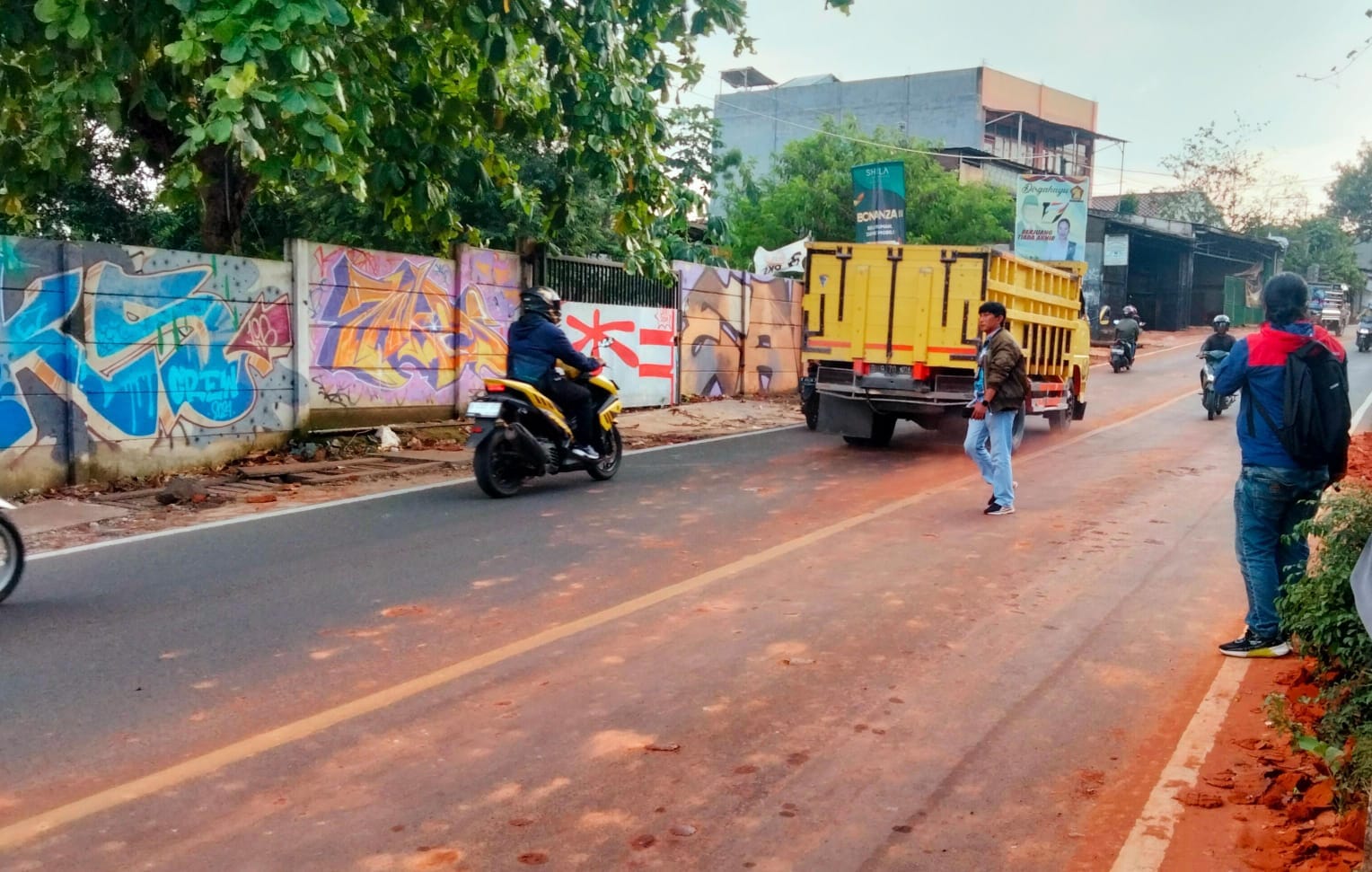 Pekerjaan Proyek penggalian tanah yang berada di Jalan Muchtar Sawangan, Depok, meresahkan pengendara, pasalya, jalan tersebut penuh dengan tanah merah yang menyebabkan debu berhamburan sehingga dapat mengganggu pengendara khusunya roda dua.