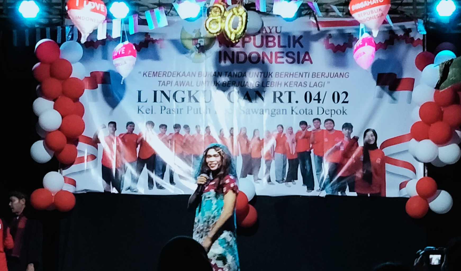 Dekorasi panggung berukuran minimalis namun ditata apik, lengkap dengan ornamen merah putih, bendera, dan atribut kemerdekaan, menjadikan malam puncak perayaan terasa hangat, guyub, dan penuh kebersamaan.